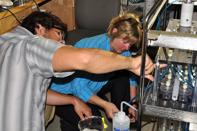 Postdoctoral investigator Bill Orsi and WHOI microbial ecologist Virginia Edgcomb, seen here working on a deep-sea robotic incubator, have been pursuing ways to sample and study microorganisms that live in extreme environments.