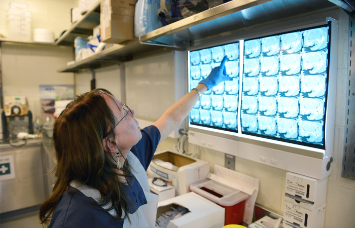 WHOI biologist Darlene Ketten checks CT images of the head of a rare whale during her physical dissection of the head in the WHOI necropsy facility. Ketten, a global expert on marine mammal ears and hearing abilities, examined the heads of two True’s beaked whales that stranded on beaches in January 2014. Meanwhile, researchers at Riverhead Foundation on Long Island, where the whales stranded, carried out necropsies on the whales’ bodies. (Ken Kostel, Woods Hole Oceanographic Institution)