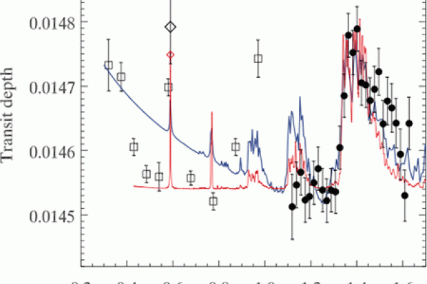 Figure ii: An example exoplanet transit transmission spectra, that of the hot Jupiter HD 209458b. The spectrum is shown as the transit depth as a function of wavelength, equivalent to an increase in the planet’s area as projected on the star. At wavelengths of prominent atmospheric atomic and molecular absorption, the planet appears larger; and at wavelengths where the planet atmosphere is transparent, the planet appears slightly smaller. The observations (black points) from the Hubble Space Telescope WFC3 show a strong absorption peak due to water vapor at 1.4 microns. The open symbols are from the Hubble Space Telescope STIS and are largely inconclusive. The colored solid lines are illustrative models, the blue one with a Rayleigh scattering type of haze absorption and the red one with a wavelength-independent small amount of absorption other than molecular gases. Many exoplanet transmission spectra show only a flat line, implying clouds completely dominate the wavelength region accessible. Most exoplanet transmission spectra are in the region of 1.1 to 1.7 microns thanks to HST WFC3. Figure from Deming et al. (2013).