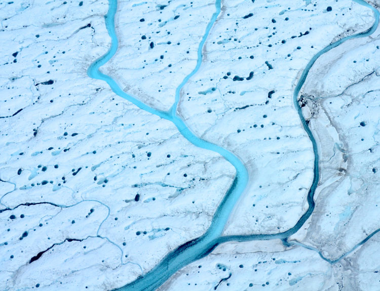 As sunlight returns to Greenland, ice melts and meltwater streams into depressions in the ice to form supraglacial lakes. (Photo by Laura Stevens, Woods Hole Oceanographic Institution)