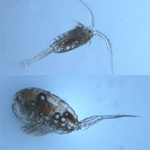 Top view (top) and side view (bottom) of the copepod species Eurytemora affinis, which Aruda studies. On its shell and inside its body this copepod species can carry large amounts of Vibrio cholerae, the bacteria that causes the deadly disease cholera. The side view appears larger than the top view, but the animals are the same size—about 1 milimeter (0.04 inch) long.
