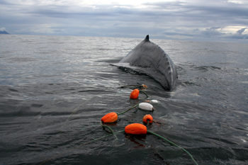 Large whales break away from anchored fishing gear, but often swim off with residual gear wrapped around their appendages, which adds substantial drag inhibiting their ability to dive and forage. Being entangled slowly drains their energy to swim and fight infections. If not disentangled, the animal ultimately dies. (Photo courtesy of NOAA Fisheries)