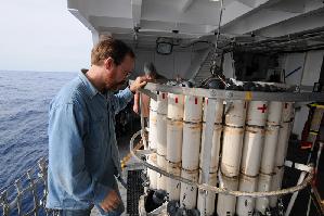 WHOI senior scientist and marine chemist Ken Buesseler (foreground) checks a CTD sampler prior to deploying the instrument to collect data and water samples from the ocean off the coast of Fukushima, Japan. (Ken Kostel, Woods Hole Oceanographic Institution)