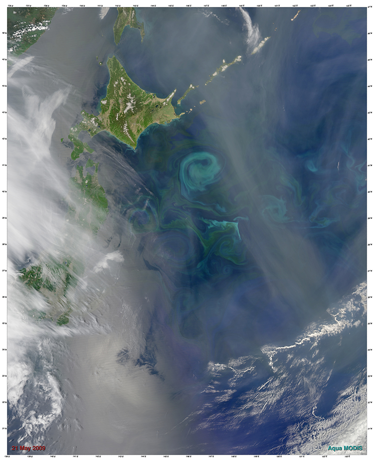This satellite image shows a large phytoplankton bloom, about 150 miles in diameter, that occurred in the Northwest Pacific Ocean off the coast of Hokkaido, Japan in May 2009. July 15, 2013Full resolution (750 × 927) ← Previous Next →