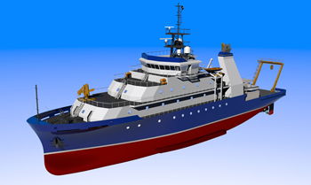 An artist’s conception of the portside bow view of the R/V Armstrong. The new research vessel will represent the latest technology and will serve a pressing need for a general-purpose ship based on the East coast of the United States. (Illustration by Guido Perla Associates; copyright U.S. Navy)