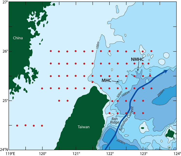 In their work to understand the strong currents over the continental shelf and slope in the East China Sea, the researchers used four ships for intensive sampling of the continental shelf and slope, and deployed several moorings and conducted high-resolution hydrographic surveys.