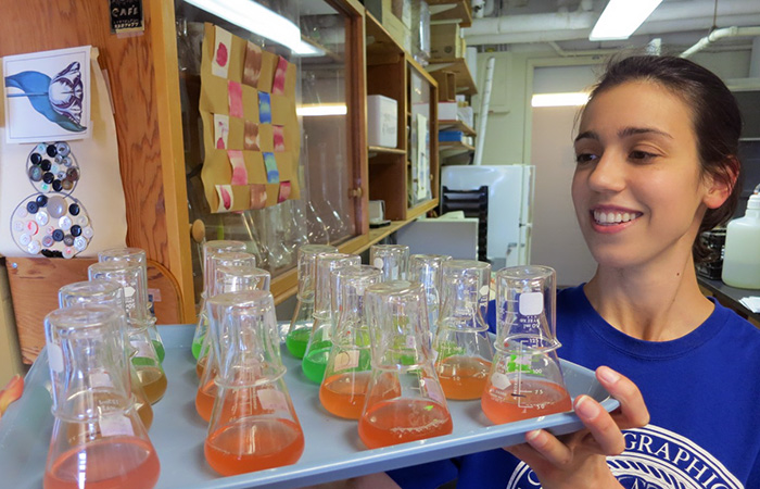 Kristen Hunter-Cevera’s Ph.D. thesis focused on exploring and understanding the population dynamics and diversity of Synechococcous, single-cell photosynthetic bacteria that are one of the most abundant and critical organisms in the ocean. But getting them to grow in the lab, so she could study them in detail, proved challenging. (Dehann Fourie, Woods Hole Oceanographic Institution)