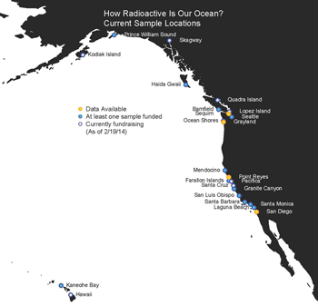 Funds have kickstarted the on-going marine radiation analyses at several locations from Alaska to coastal Canada, down the West Coast of North America and out to Hawaii. (Illustration by Colleen Durkin, Woods Hole Oceanographic Institution)