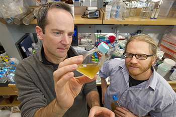 Chemist Tracy Mincer (left) and biologist Matt Johnson (right) are among several WHOI researchers who received funding from the Gordon and Betty Moore Foundation’s Marine Microbiology Initiative to study the complex role marine microbes play in the ocean ecosystem.