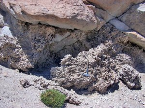 Ikaite-300×224 April 14, 2016Full resolution (300 × 224) ← Previous Next → Photograph of ikaite deposits at Laguna de Tara. These calcium carbonate formations are found in protected spaces beneath large boulders that shield it from the harsh landscape. Photograph by Jay Quade. (Neil Murthy/Medill)